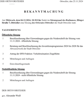 Am Mittwoch, dem 04.12.2024, 18:30 Uhr findet im Sitzungssaal des Rathauses, Illinger Straße 7, Ottweiler eine Sitzung des Ortsrates Ottweiler der Stadt Ottweiler statt.