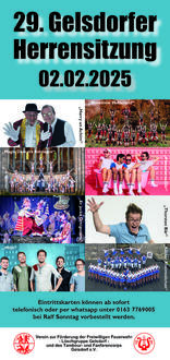 GRAFSCHAFT GELSDORF. Der Förderverein der Freiwilligen Feuerwehr und des Tambour- und Fanfarencorps Gelsdorf e.V. veranstaltet am 2. Februar 2025 wieder seine altbekannte Herrensitzung und würde sich freuen, wieder viele karnevalistische Männer auf unserer Veranstaltung begrüßen zu dürfen, um gemeinsam ein paar schöne Stunden mit buntem Programm zu erleben. Mit dabei sind „Harry und Achim“, „Showtime Mutscheid“, „Magic Dancers Remagen“, „Planschemalöör“, „Et jecke Dreigestirn“, „Thorsten Bär“, „Miljö“ und die „Kölner Rheinveilchen“. Eintrittskarten können ab sofort telefonisch oder per Whatsapp unter 0163 / 7769005 bei Ralf Sonntag vorbestellt.