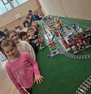 Die stolzen Baumeisterinnen und Baumeister am Rande der entstandenen Lego-Welt