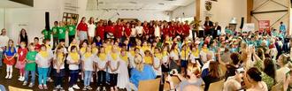 Die Grundschule Ringen kam nicht mit einem Schulchor, sondern gleich mit allen 110 Schülern, die unter der Leitung von Thomas Mumm in ihren blauen T-Shirts und kunterbunten Kopfbedeckungen aller Art die Bühne stürmten. Diese Hüte spielten auch eine Hauptrolle bei ihrem ersten Lied „Hut ab“ von Rolf Zuckowski. Zunächst wurde mit den Hüten gegrüßt, am Schluss flogen sie in die Höhe und blieben auf der Bühne liegen. Weiter ging es mit „Wir ziehen in den Frieden“ und „Unsere Schule (Ein Platz zum Leben – ein Platz für Alle)“.