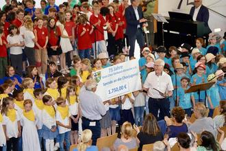 Günter Nerger präsentiert mit Hinweis auf das 75-jährige Bestehen des Kreis-Chorverbands einen symbolischen Scheck „Spende an die Chorjugend“ in Höhe von 1.750 Euro.