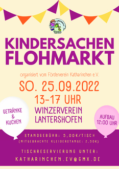 LANTERSHOFEN. Der Förderverein Katharinchen e.V. der KiTa St. Katharina Lantershofen lädt am Sonntag, 25. September zum Kindersachen-Flohmarkt ein. Zwischen 13 und 17 Uhr werden im Lantershofener Winzerverein Spielzeug, Kinderkleidung und weitere Artikel rund ums Kind angeboten. Die Besucher erwartet außerdem ein Kuchenbasar. Die Erlöse kommen wie immer den Kindern der KiTa zugute. Die Vergabe der Verkaufstische erfolgt ab sofort über die E-Mail Adresse katharinchen.ev@gmx.de mit dem Betreff „Flohmarkt“. Die Standgebühr beträgt 5 Euro pro Tisch, für eine mitgebrachte Kleiderstange werden zusätzlich 2,50 Euro erhoben.