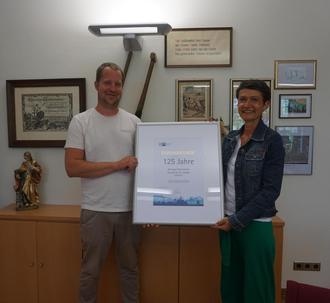 IHK-Regionalgeschäftsführerin Andrea Strenz überreichte die Jubiläumsurkunde an Geschäftsführer Simon Schaaf.