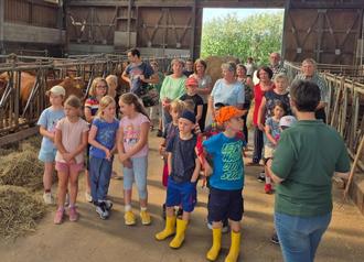 Danach ging es direkt zu den Kühen in den Stall. Hier erfuhren die neugierigen Gäste alles über die Haltung der Tiere. Besonders fasziniert waren die Kinder, als sie den Heuballen ausrollen und mit dem Heu die Kühe füttern durften. Mit Heu ausgestattet, machten sie sich daran, die hungrigen Kühe zu versorgen – ein Erlebnis, das den Kindern viel Freude bereitete.