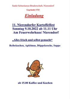 „Die Vorbereitungen für das 11. traditionelle Kartoffelfest am 9. Oktober laufen auf Hochtouren“, so Hans Peter Moog, Vorsitzender der Sankt Sebastianus Bruderschaft, Nierendorf als Veranstalter.