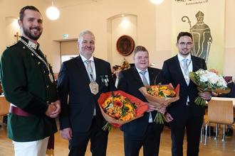 Blumen für die Könige und Jubilare: Marco Böhm (v.l.) gratuliert Werner Braun, Manuel Efferz und Nils Henscheid.
