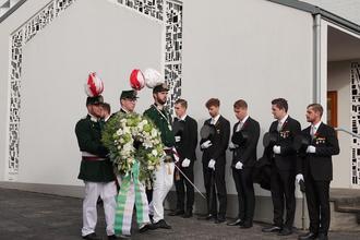 LANTERSHOFEN. TW. Es war das Jahr 1927, als man in Lantershofen Rituale zum Feiern der Kirmes einführte. So manches hat sich seitdem verändert, den Kern mit Schützenkönig und Stechschrittparaden aber hat man beibehalten. Drohen diese Traditionen nun zu sterben? Folgt man den Worten des aktuellen Vorsitzenden und Hauptmanns der Junggesellen-Schützen-Gesellschaft, Marco Böhm, so steht der Ort hinsichtlich seiner weithin bekannten Art zu feiern vor einer Wende. Die könnte sogar mit der Auflösung des gastgebenden Vereins enden. Böhms Worte zogen sich wie ein roter Faden durch den für Junggesellen und die Bürgervereinigung wohl wichtigsten Part der Kirmes, den Festkommers am Montagmorgen. Dem ging ein Festgottesdienst voran, danach trafen sich in der Männerrunde knapp 200 Gäste, Junggesellen in ihren grünen Röcken, Bürger und Ehrengäste schwarz gekleidet mit Zylindern auf dem Kopf.