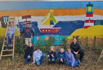 Der Einladung waren einige Kids gefolgt, die unterstützt wurden von den Youngstars. Zügig entstand ein Meeresmotiv mit Leuchtturm, Strandkorb, aber auch einer bunten Unterwasserwelt mit zahlreichen Meeresbewohnern und einem glücklichen Delfin im Vordergrund des Sonnenunterganges. Sogar das Nierendorfer Fröschelchen thront zufrieden am Ende des Meeres-Steegs.