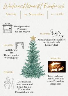 NIEDERICH. Am 1. Advent ist es endlich soweit. Der Brauchtums- und Verschönerungsverein Niederich e. V. veranstaltet wieder seinen traditionellen Weihnachtsmarkt. Jeder ist ganz herzlich eingeladen, am 30. November, von 12 bis 19 Uhr eine gemütliche Zeit auf dem festlich geschmückten Dorfplatz zu verbringen und sich auf die Weihnachtszeit einzustimmen. In diesem Jahr lädt der Dorfverein erstmalig bereits samstags ab 17 Uhr zu einem Glühweinabend in stimmungsvoller Kulisse ein.
