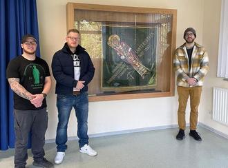 Majestät Jan Sommer, Tragfähnrich Florian Ropertz und Hauptmann Clemens Queckenberg freuen sich die Fahne von 1967 ab jetzt unter bestmöglichen Bedingungen lagern zu können.