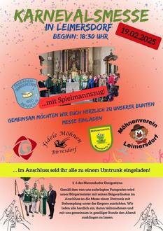 LEIMERSDORF. Unter Mitwirkung des Fanfaren-Tambourcorps 1920 Bengen e.V., der Fidele Möhnen Birresdorf, des Möhnenvereins Nierendorf e.V. und des Möhnenvereins Leimersdorf findet am 19. Februar in Leimersdorf um 18.30 Uhr die Karnevalsmesse statt, zu der herzlich eingeladen wird. Gemäß Paragraph 6 des Nierendorfer Dreigestirns wird der Bürgermeister mit seinen Beigeordneten im Anschluss an die Messe einen Umtrunk mit Stehplatz unter der Empore ausrichten, zu dem ebenfalls alle herzlich eingeladen sind um den Abend dann gesellig ausklingen zu lassen.