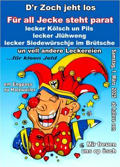 HOLZWEILER. Samstag, 1. März, ab haleve een: D’r Zoch jeht los. Für al Jecke steht parat lecker Kölsch un Pils, lecker Jlühweng, lecker Siedewürschje im Brütsche un vell andere Leckereien...für kleen Jeld em Engpass zu Holzweiler.