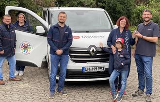 Die Malteser (v. l.): Christian Darantik, Anke Sattler und Felix Gäßler) freuen sich mit Gemeindereferentin Manuela Kremer-Breuer, ihrem Sohn und dem Bundesbeauftragten der Malteser Fluthilfe, Wolfgang Heidinger, darüber, dass künftig viele Transporte für Hochwasserbetroffene leichter zu bewerkstelligen sind.