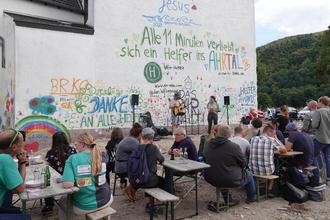 Nun gab es bei Barbecue und kalten Getränke noch viele Gespräche über und um das wohl meistfotografierte Haus im Ahrtal nach der Flutkatastrophe. Dutzende von Menschen waren gekommen, um sich das Haus noch einmal anzuschauen. Für musikalische Unterhaltung sorgte dazu Thomas Enns von der christlichen Band Könige & Priester.