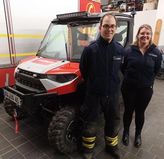 Wehrführer Florian Ulrich und die stellvertretende Wehrführerin Anna Lina Helbing freuen sich über das neue Fahrzeug.