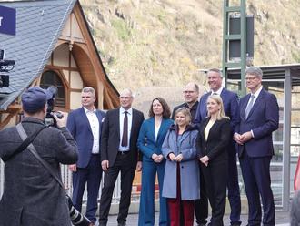 Bitte lächeln: Dutzende Kameras standen bereit, die am vergangenen Freitag in Altenahr die Prominenz und die Entscheider über Wiederaufbau und Modernisierung der Ahrtalbahn verewigten. Zur Eröffnung waren neben Bahnchefin Palla auch Bundesverkehrsminister Schnieder und Ministerpräsident Schweitzer gekommen.