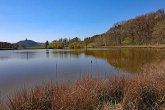Der Wanderweg führt auch am Rodder Maar vorbei und erlaubt bemerkenswerte Blick auf die Burg Olbrück.