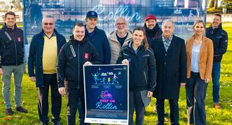 Jan Ritter (l.), Christian Senk (r.) sowie Dominik Kremer (vorne l.) und Carolin Welsch (vorne r.) von der Marketing GmbH sowie Christian Lersch (4.v.r.) vom Uferlichter e.V. dankten den Sponsoren der Rollschuhbahn: (v.l.) Roland Brunner (Rotary), Guido Henseler (Spenden-Shuttle), Jürgen Preuß (Rotary), Dietrich Holz (Rotary) und Jeannette Hess (AWO international)