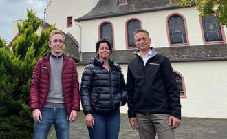 Begutachteten die neue LED-Beleuchtung an der Katholischen Pfarrkirche St. Nikolaus in Kasel (v. l.): Henrik Lewna, Esther Jansen sowie Marco Felten. (Foto: David Kryszons/Westenergie)