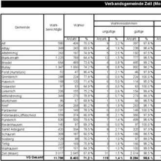 Zu dem reibungslosen Ablauf und der schnellen Ergebnisermittlung haben in der Verbandsgemeinde Zell (Mosel) rd. 280 Helferinnen und Helfer durch ihren tatkräftigen Einsatz in den örtlichen Wahllokalen beigetragen. Allen Wahlvorständen sage ich hierzu ein herzliches Dankeschön!
