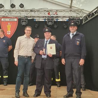 Darüber hinaus erhielt Herr Ferdinand Schmitz von Herrn Bürgermeister Hoffmann im Auftrag von Herrn Landrat Schnur für seine 45-jähirge Mitgliedschaft bei der Freiwilligen Feuerwehr Alf das Goldene Feuerwehrehrenzeichen.