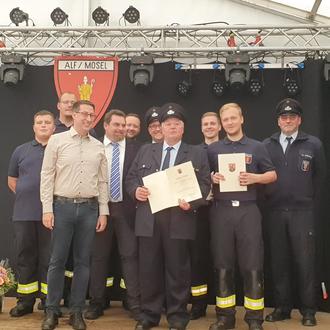 Für Ihre 15-jährige ehrenamtliche Tätigkeit bei der Freiwilligen Feuerwehr Alf wurden Herr Pascal Fuhrmann, Herr Jan Henrichs sowie Herr Nils Henrichs mit dem Bronzenen Feuerwehrehrenzeichen ausgezeichnet.