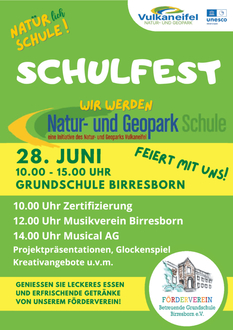 Das Schulfest an unserer Grundschule Birresborn steht vor der Tür: Freut euch auf spannende Aktionen, Spiel- und Kreativstationen und mehr am Samstag, 28. Juni ab 10:00 Uhr. Besonders stolz sind wir darauf, dass unsere Schule zur Natur- und Geoparkschule zertifiziert wird – ein Meilenstein für Umweltbildung und Naturerlebnis. Seid dabei und feiert mit uns dieses besondere Ereignis!