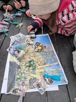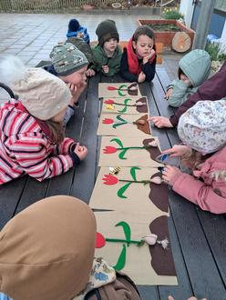 Besonders spannend wurde es beim anschließenden Forschen auf dem Außengelände des Kindergartens. Dort suchten die Kinder kleine Bildkarten von Frühblühern, die zuvor besprochen wurden. Mit viel Aufmerksamkeit und Teamgeist fanden sie die richtigen Plätze und legten die Karten passend in ein großes vorbereitetes Bild.