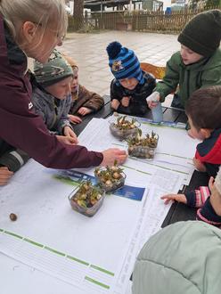 Auch ein kleines Experiment durfte natürlich nicht fehlen: Die Kinder füllten kleine Gläser mit Steinchen, gossen Wasser hinein und setzten vorsichtig eine Blumenzwiebel darauf. So konnten sie beobachten, wie sich die Wurzeln im Wasser entwickeln und die Pflanze langsam nach oben wächst. In den kommenden Tagen dürfen die Kinder nun täglich verfolgen, wie ihre Pflanze wächst und schließlich vielleicht sogar zu blühen beginnt.