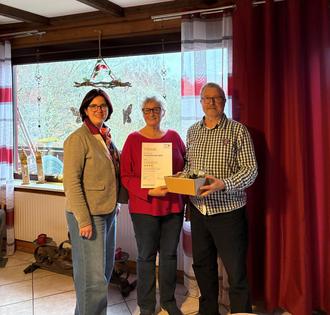 In einer feierlichen Übergabe überreichte Bürgermeisterin Tamara Breitbach und der Leiter der Tourist-Information Daniel Thiel die Urkunde sowie ein Präsent an Frau und Herr Linnartz, die Inhaber der Ferienwohnung Angela.