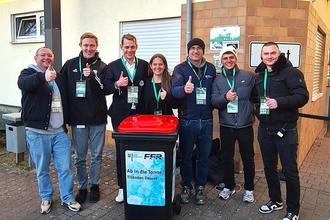 Helfer des DFB und der Stadt Kelsterbach freuen sich über die von der FFR GmbH gespendeten Eistonnen.