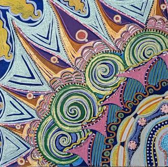 Für ihre Bilder nutzt sie überwiegend Acrylfarben und -stiften, findet es aber auch sehr spannend, andere Malmedien und Materialien miteinander zu kombinieren.