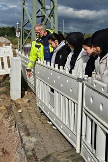Den Anfang machte Maik Schubert vom Team Tiefbau. Er besuchte als Erstes die Trinkwasser- und Abwasseranlagen. Als ausgebildeter Rohrnetzmeister konnte er den Mädchen viel erklären und informierte darüber, dass das Trinkwasser regelmäßig kontrolliert wird, damit es eine einwandfreie Qualität beibehält. Im Anschluss fuhr die Gruppe zur Baustelle am Aspenhaag. Dort werden die alten Rohre unter der Straße getauscht und neue verlegt. Als letzte Station ging es für die Mädchen in den Wald, um sich die Abwasserpumpstation anzusehen. An dieser Stelle sammelt sich das Abwasser aus Kelsterbach, dem Flughafen und aus Raunheim. Mit Pumpen wird es unterhalb des Mains zur Kläranlage nach Sindlingen befördert und dort aufbereitet.
