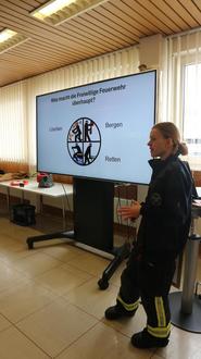 Die letzte Station des Tages war die Freiwillige Feuerwehr, die im Langen Kornweg 15 ihre Domizil hat. Nach einem Imbiss wurde den Schülerinnen zunächst eine Präsentation über die Einsatzgebiete und die Organisation der Feuerwehr gezeigt. Der größte Punkt hierbei ist die Freiwilligkeit, die die Kelsterbacher Feuerwehr von Berufsfeuerwehren aus größeren Städten wie Frankfurt unterscheidet. Neben Beruf und Familie seien die Kameradinnen und Kameraden bei der Freiwilligen Feuerwehr stark eingebunden, erklärte Nicole Wörpel, die im städtischen Brand- und Katastrophenschutz angestellt ist. Zusammen mit Sandra Schildbach, die gerade ihr Freiwilliges Soziales Jahr bei der Feuerwehr macht und auch privat seit Jahren im Brandschutz engagiert ist, und dem Gerätewart Sven Schreiber, stellten sie die vielfältige Arbeit vor.