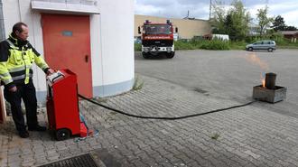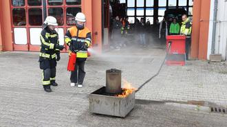 Fertig zum Löschen. Sandra Schildbach zeigt einer Schülerin, wie sie den Brand sicher löschen kann.