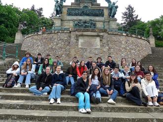 Am nächsten Tag stand ein Ausflug in den Rheingau auf dem Besuchsprogramm. Mit der Bahn ging es zunächst nach Rüdesheim, dem Start- und Zielpunkt einer Ringtour. Diese führte die Gruppe erst per Boot über den Rhein nach Assmannshausen und von dort per Sessellift hinauf zum Niederwald. Der Landschaftspark Niederwald ist eine romantische Parkanlage, deren Sehenswürdigkeiten – zum Beispiel eine künstliche Burgruine – und zahlreiche grandiose Ausblicke ins Rheintal die Besucher begeisterten. Nicht zuletzt ist er bekannt für sein gleichnamiges, monumentales Denkmal, das dort im Jahre 1883 errichtet wurde und den Sieg der Truppen Preußens und seiner Verbündeter im Krieg mit Frankreich 1870/71 und die damit verbundene Gründung des Deutschen Kaiserreichs verherrlicht. Mit dem Thema hatten sich die französischen Schülerinnen und Schüler bereits eingehend im Unterricht auseinandergesetzt, genauso wie mit weiteren Sehenswürdigkeiten des Rheintals – etwa dem Loreley-Felsen oder dem Binger Mäuseturm. Mit der Gondelbahn ging es zurück nach Rüdesheim, wo die Reisegruppe sich unter anderem die berühmte Drosselgasse ansah.