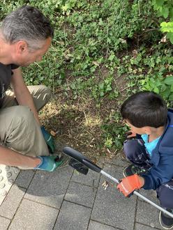 Erik Lindenberg und sein Sohn hatten viel Mühe kleine Plastikverpackungen und Zigaretten unter den Büschen zu entfernen.