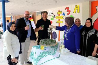 Bürgermeister Manfred Ockel (3. v.l.) und Stadtverordnetenvorsteher Frank Wiegand (2. v.l.) genießen frischen Minztee am Stand des Frauenbeirat Marokkanischer Kulturverein