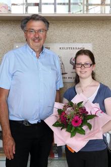 Bürgermeister Manfred Ockel gratuliert der Kelsterbacher Jugend-forscht-Preisträgerin Anja Armstrong
