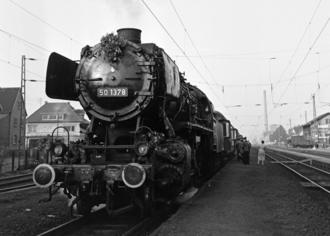 Im Jahr, als die glorreiche Frankfurter Eintracht Deutscher Meister wurde, stand auch dieses schöne Dampfross im Bahnhof Kelsterbach. Genauer gesagt im Mai 1959. Die Lokomotive hat die Kennzeichnung 50 1378 die besagt, dass es sich um eine Lok aus der Baureihe 50 handelt. Sie war eine der meistgebauten Dampflokomotiven und verrichtete bis 1977 ihren offiziellen Dienst bei der Deutschen Bundesbahn. Die hier abgebildete Lokomotive wurde im Jahr 1941 in Dienst gestellt und 1965 ausgemustert. Warum die Lok geschmückt wurde, ist leider nicht bekannt. Des Weiteren kann man gut erkennen, dass die Fahrgäste jener Zeit noch quer über die Gleise laufen mussten, um zum Zug oder zum Bahnsteig zu gelangen. Die Elektrifizierung der „Mainbahn“ erfolgte etwa ein halbes Jahr zuvor, nämlich Ende 1958. (Text/Bild: cs/Stadtarchiv Kelsterbach)