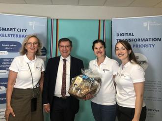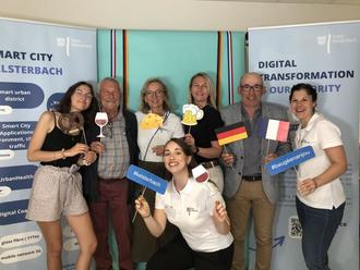 Dieses Mal mit dabei waren drei Vertreterinnen der Stadtverwaltung Kelsterbach. Die Digitalisierungscoachs Ramona Krieger und Xenia Lämmle sowie die städtische Wirtschaftsförderin Anja Warnecke-Bi reisten am 2. Juni nach Baugé-en-Anjou, um dort über den aktuellen Stand zum Thema Digitalisierung und Smart City zu informieren. Eigens hierfür angefertigte Roll-ups zeigten die wichtigsten Punkte auf. Zum besseren Verständnis wurden darüber hinaus noch französisch-sprachige Flyer vorbereitet und verteilt. Eine Fotoleinwand lud die Besucher ein, den gemeinsamen Moment mit einem Foto festzuhalten, was zahlreich genutzt wurde.
