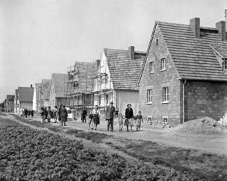 Damals wie heute herrschte notorischer Wohnungsnotstand, auch in Kelsterbach. Und damals wie heute wurde durch den Bau neuer Wohneinheiten versucht, diesem Missstand entgegenzuwirken. Der Vorteil in den Nachkriegsjahren war sicherlich der, dass man noch reichlich unbebauten Platz hatte und man sich gen Oberdorf ausdehnen konnte. Auf dem Bild vom Juni 1949 gab es an diesem Tag für Glanzstoffangehörige die Gelegenheit, sich die kurz vor der Fertigstellung stehenden Häuser in der Siedlung (nicht zu verwechseln mit den Siedlerhäusern), die so genannten Glanzstoffhäuser, von innen anzusehen. Nachdem man sich ein Bild von den Wohnungen gemacht hatte, konnte man sich entscheiden, ob man sich für eine Wohnung bewerben wollte. Rund um die Häuschen gab es obendrauf noch einen Garten der bewirtschaftet werden konnte, um sich ein wenig selbst zu versorgen. Der Feldweg, auf dem die Pilgerschar entlangläuft, ist übrigens die heutige Straße „Kleiner Kornweg“. Die kleinen Häuschen mit je zwei Wohneinheiten, fielen nach der Jahrtausendwende der Abrissbirne zum Opfer, um Platz für moderne Wohnhäuser zu schaffen.