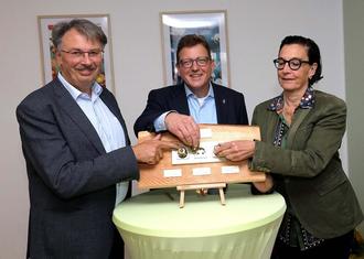 (vl) Bürgermeister Manfred Ockel, Stefan Sauer, hessischer Staatssekretär für Digitalisierung und Innovation und Marion Schmitz-Stadtfeld, Leiterin der Integrierten Stadtentwicklung der NH ProjektStadt, eröffneten das KelsterLab.