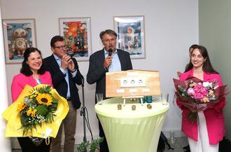 Hessens Digital-Staatssekretär Stefan Sauer (2.v.l.) und Bürgermeister Manfred Ockel dankten Ramona Krieger (l.) und Xenia Lämmle (r) vom Team Digitalisierung.