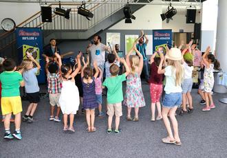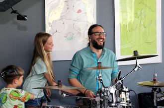 Vergangenen Mittwoch wurde es laut in der Stadt- und Schulbibliothek. In Kooperation mit der Musikschule war die Kölner Kinderrockband Pelemele eingeladen worden, um bereits zum dritten Mal ein Konzert in der Bücherei zu geben. Etwa 30 Kinder und ebenso viele Erwachsene hatten den hohen Temperaturen an diesem Tag getrotzt, um zu den Liedern der Band zu tanzen, zu hüpfen und abzurocken. Von Anfang an war Mitmachen angesagt: Beim ersten Song „Wecker“ konnten sich die Kinder an einem Luftgitarrensolo versuchen, bei „Stopp!“ gab es eine immer schneller werdende Version des beliebten Stopptanzspiels und bei „Kitzelüberfall“ durften die kleinen Nachwuchs-Rocker nach Herzenslust die Bandmitglieder oder ihre Eltern durchkitzeln. Da war es kein Wunder, dass schon nach diesen ersten drei Liedern die gute Laune einen ersten Höhepunkt erreicht hatte.