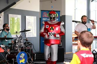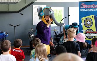 Pelemele, die seit über 20 Jahren Jung und Alt mit ihrer Mischung aus Rock, Pop, Disco, Hip Hop und Ska begeistern, hatten aber noch weitere Stimmungs-Asse im Ärmel: So mussten die Kinder bei „Ballon“ dafür sorgen, dass zwei große Luftballons während des Songs nicht den Boden berührten. Und als sich Keyboarder Florian in den Roboter „Arnold 100“ verwandelte und das Publikum zum Robotertanz aufforderte, war neben der Musik auch sehr viel freudiges Lachen zu hören. Zum Finale feuerte Sänger Picco die kleinen Fans dann noch einmal richtig an: „Jetzt springt richtig wild mit, damit Ihr Euch eine Zugabe verdient.“ Das mussten sich der Kelsterbacher Nachwuchs nicht zweimal sagen lassen, so dass ein letztes Mal an diesem Nachmittag die Bücherregale zum Beben gebracht wurden.