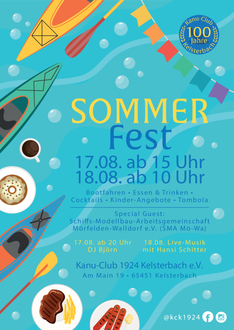 Am vergangenen Samstag, eine Woche vor dem Beginn des Sommerfestes 2024, hat der Kanu-Club Kelsterbach den zweiten Vorbereitungsarbeitseinsatz für das am 17./18. August geplante Fest durchgeführt. Etwa 20 Helfer des Vereins wuselten im Vereinsgebäude herum und kehrten, wischten und saugten, um den Verein bei dem Fest von seiner besten Seite zu präsentieren. Um auch in jede Ritze zu gelangen und zudem das Oberlicht in der Bootshalle reinigen zu können, musste die Halle zunächst ausgeräumt werden. Die zwischengelagerten Vereins- und Privatkanus boten ein buntes Bild auf der Wiese vor dem Vereinsgebäude. Der Aufbau von Zelten, Essen- und Getränkeausgabe sowie der Bühne für die Musik auf eben dieser Wiese erfolgt in den Tagen unmittelbar vor dem Fest, das angesichts des 100-jährigen Bestehens des Vereins einmalig wieder über zwei Tage ausgetragen wird. Letztendlich erhofft man sich natürlich gutes Wetter für diese große Veranstaltung des Vereins, im Rahmen derer auch die sportlichen Aktivitäten auf dem Wasser vorgestellt und zum Ausprobieren angeboten werden. Verbunden damit ist die Hoffnung auf großes Besucherinteresse, damit sich der Aufwand auch lohnt. Ein selbst kreiertes Plakat weist auf die Angebote hin, welche die Besucher des Festes erwarten können.