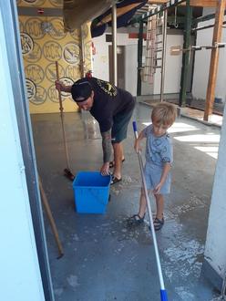 David und Leon beim Putzen der Bootshalle