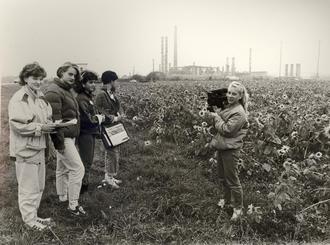 Im Jahr 1982 machten sich fünf Schülerinnen der IGS Kelsterbach auf den Weg Richtung Caltex. Dort angekommen, positionierten sie sich fachmännisch, um eine Videoreportage über die damalige Ölraffinerie zwischen Kelsterbach und Raunheim abzudrehen. Begleitet wurden sie dabei von Walter Keber, von dem auch diese Aufnahme stammt. Welchen Inhalt und Zweck genau diese Reportage hatte, ist leider nicht mehr bekannt. Vielleicht über das nahende Ende der Raffinerie, da die Caltex zum 31.12.1982 ihren Betrieb einstellte. Die ehemalige Anlage, die man im Hintergrund sieht, stand dort, wo sich heute das Gewerbegebiet Mönchhof befindet. Ebenfalls schön zu sehen ist, dass auch noch im Bereich zwischen Caltex und Klaraberg Landwirtschaft betrieben wurde. (cs)