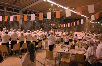 Die „Hackballen“ werden dabei jedes Jahr vom Team des traditionellen Hackfleischessens zubereitet, das in diesem Jahr aus 16 Altkerweborsch und Altgiggelsmädchen bestand. 150 Hackballen mit zehn Kilogramm Zwiebeln für die Soße wurden frisch zubereitet, um ausreichend Essen für die 100 angemeldeten Gäste parat zu haben.